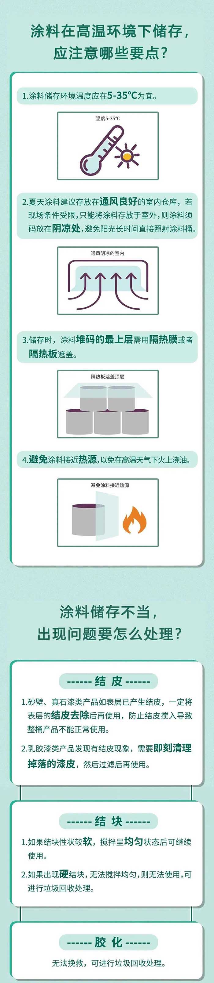 夏天的高溫天氣即將到來。水性涂料在高溫環(huán)境下儲存,或者遭遇長時間的太陽直曬,會導(dǎo)致桶身和桶蓋金屬材質(zhì)溫度迅速升高,使得與其接觸的涂料,特別是表層涂料出現(xiàn)結(jié)皮、結(jié)塊、膠化等現(xiàn)象,影響涂料的正常使用。