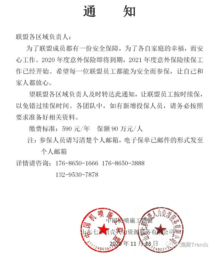 中國機噴施工聯(lián)盟2021年度保險續(xù)保通知(圖文)