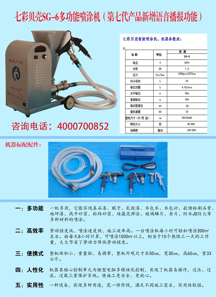 一機多用,它能實現(xiàn)真石漆、質(zhì)感、膩子、粉刷石膏、乳膠漆、底漆、油漆、地坪漆、找平砂漿、粘結(jié)砂漿、掛網(wǎng)砂漿、硅藻泥、彈涂、玻璃鱗片、巖片、防水JS防火、保溫材料、單組份聚氨酯等十多種材料的噴涂。噴涂厚度為1-10mm(也可以根據(jù)噴槍走的快慢來調(diào)整噴涂厚度)噴射寬度30-50CM。